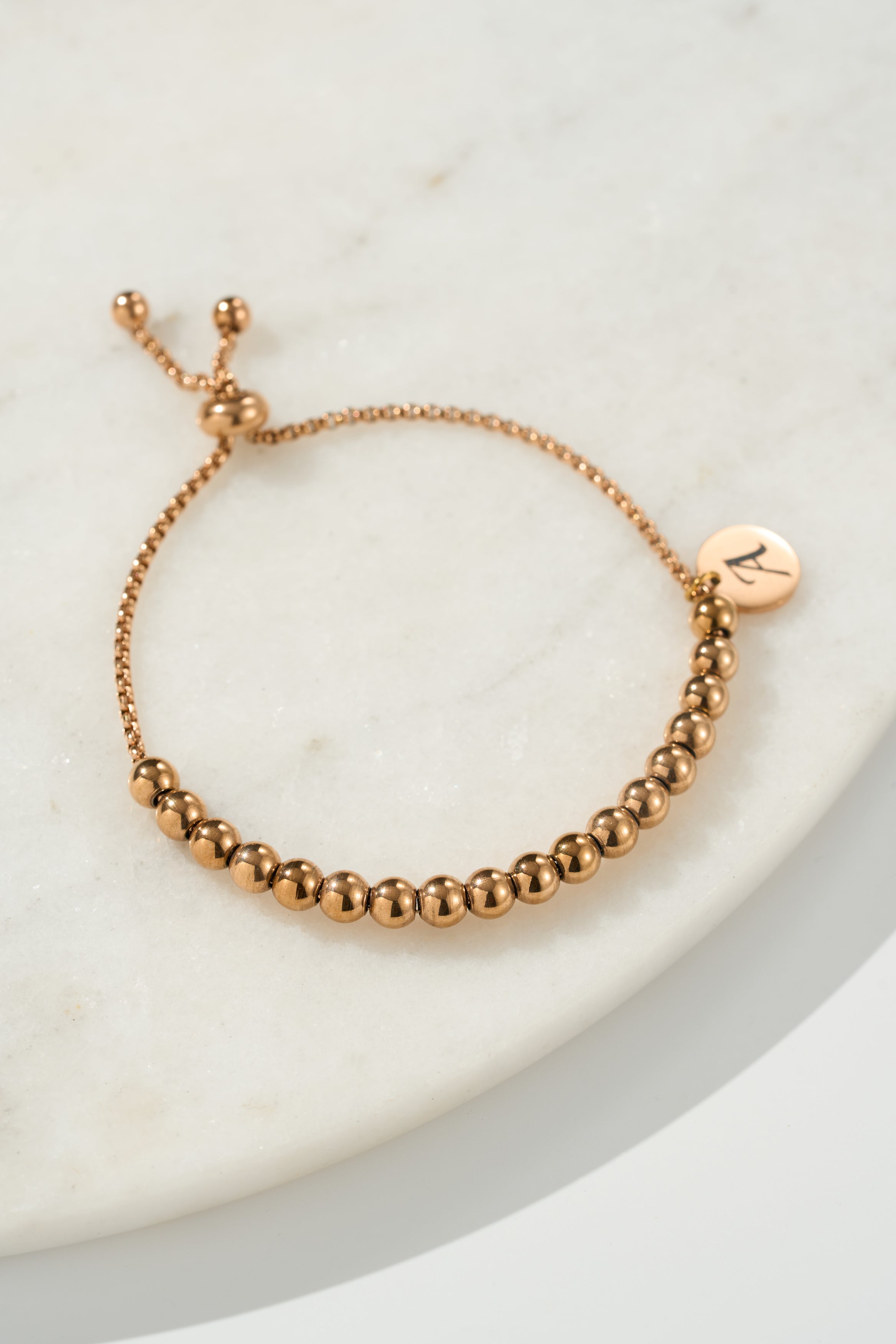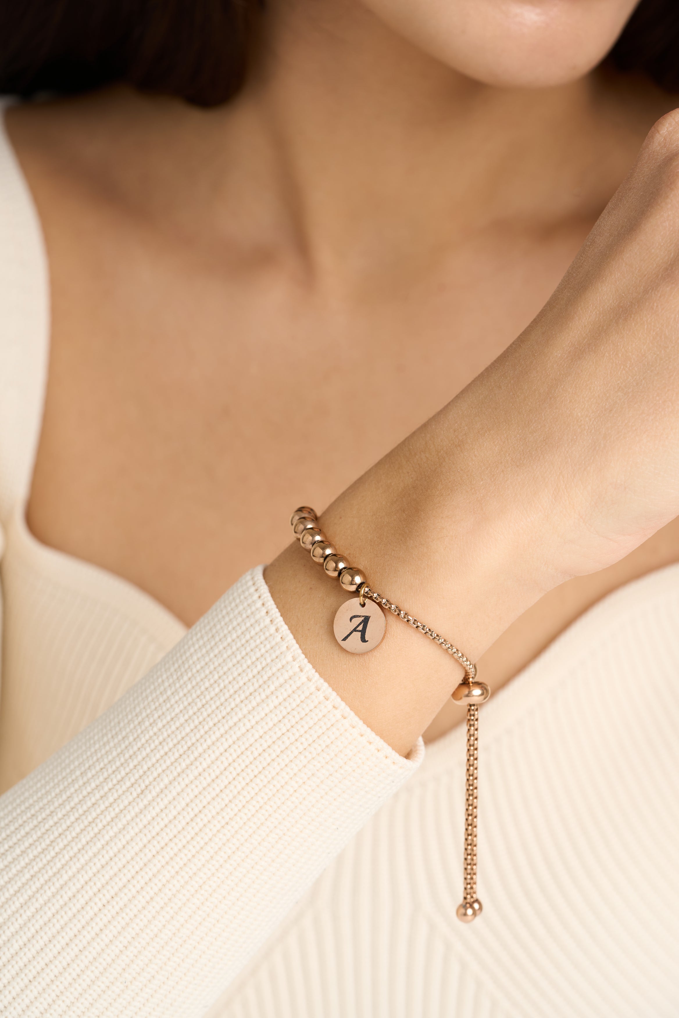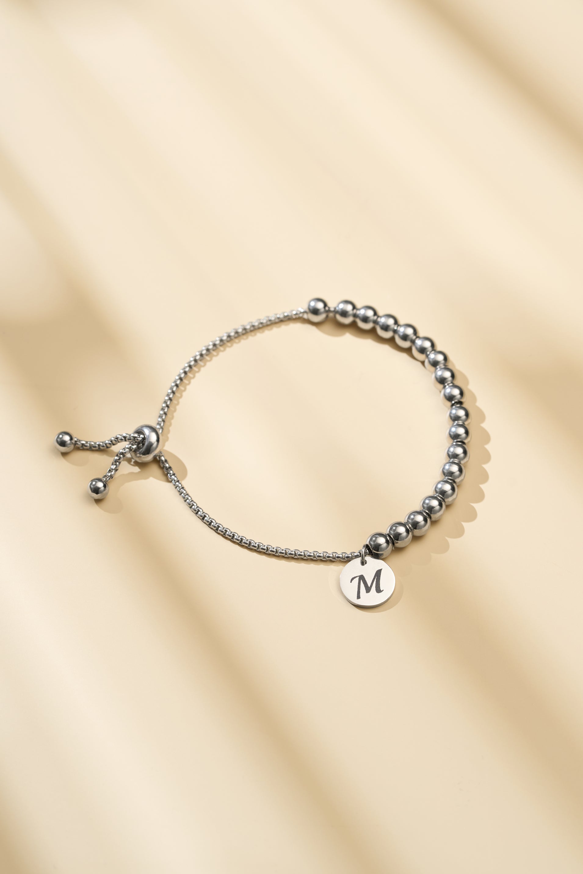 Create your unique piece with our elegant Beaded Initial Bracelet featuring smooth beaded design with an adjustable slider closure and a personalized letter charm. This minimalist bracelet combines style and meaning for a truly special accessory.