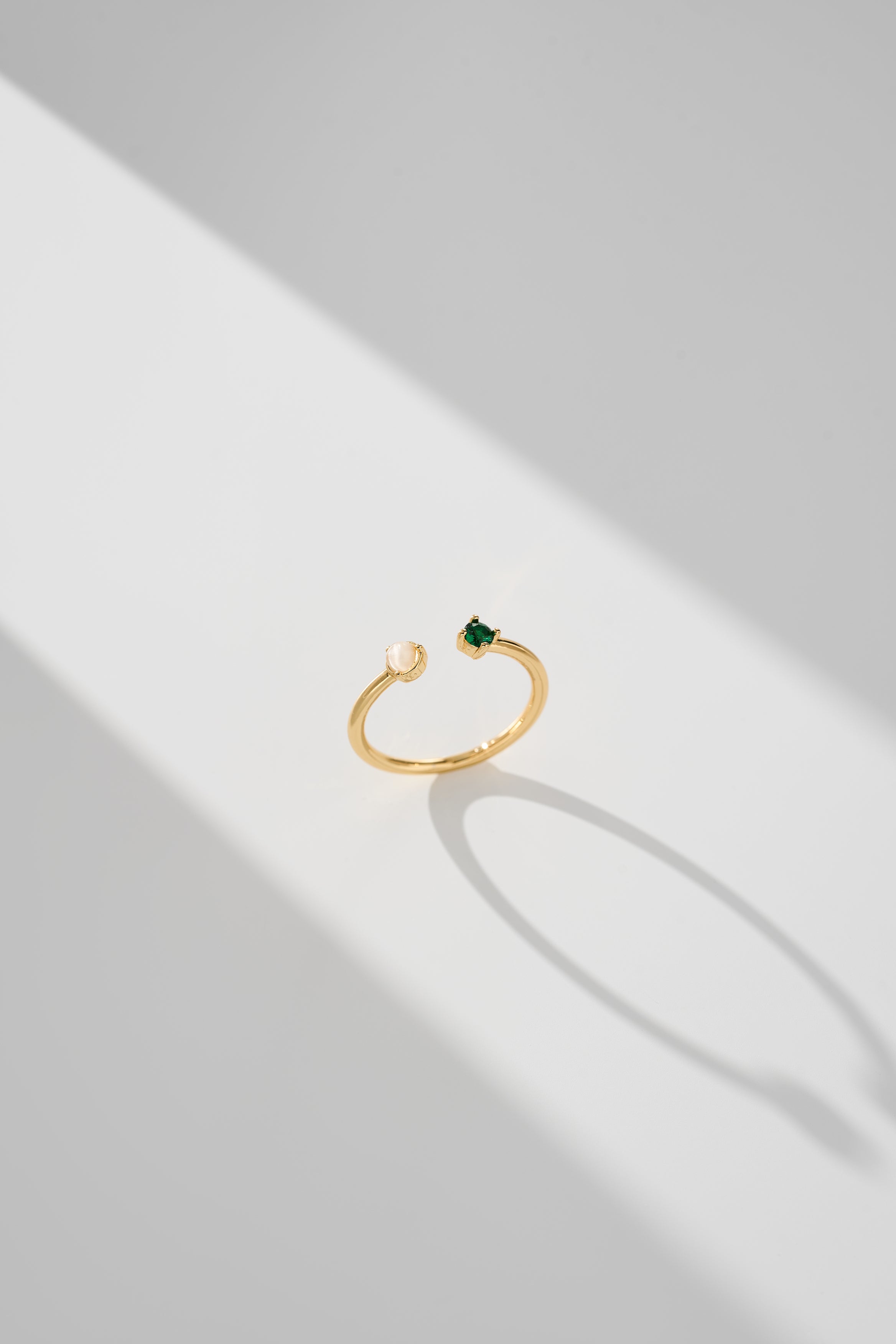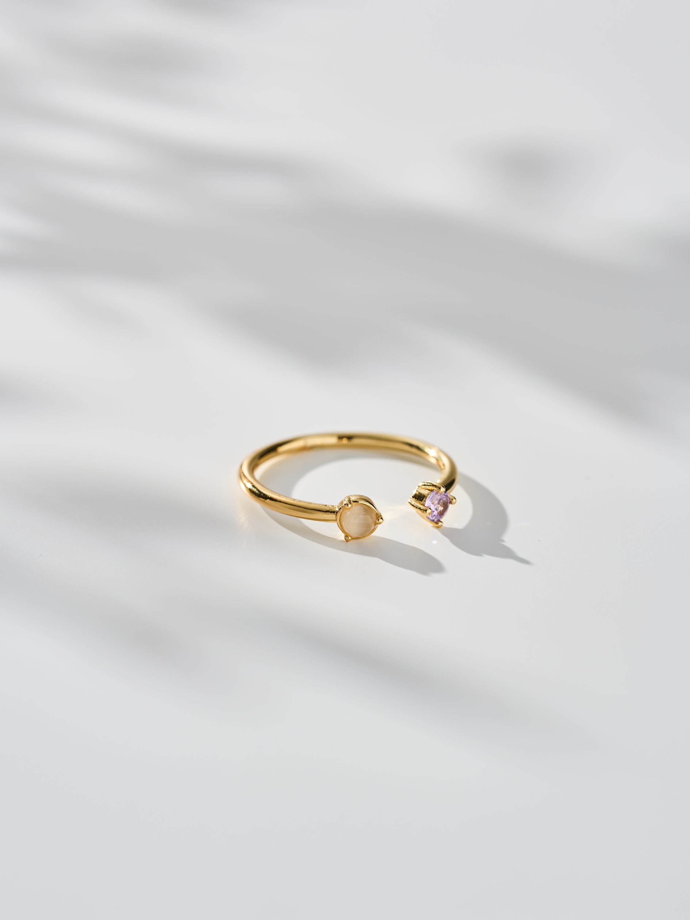 • Elegant open-band design with dual gemstone accents