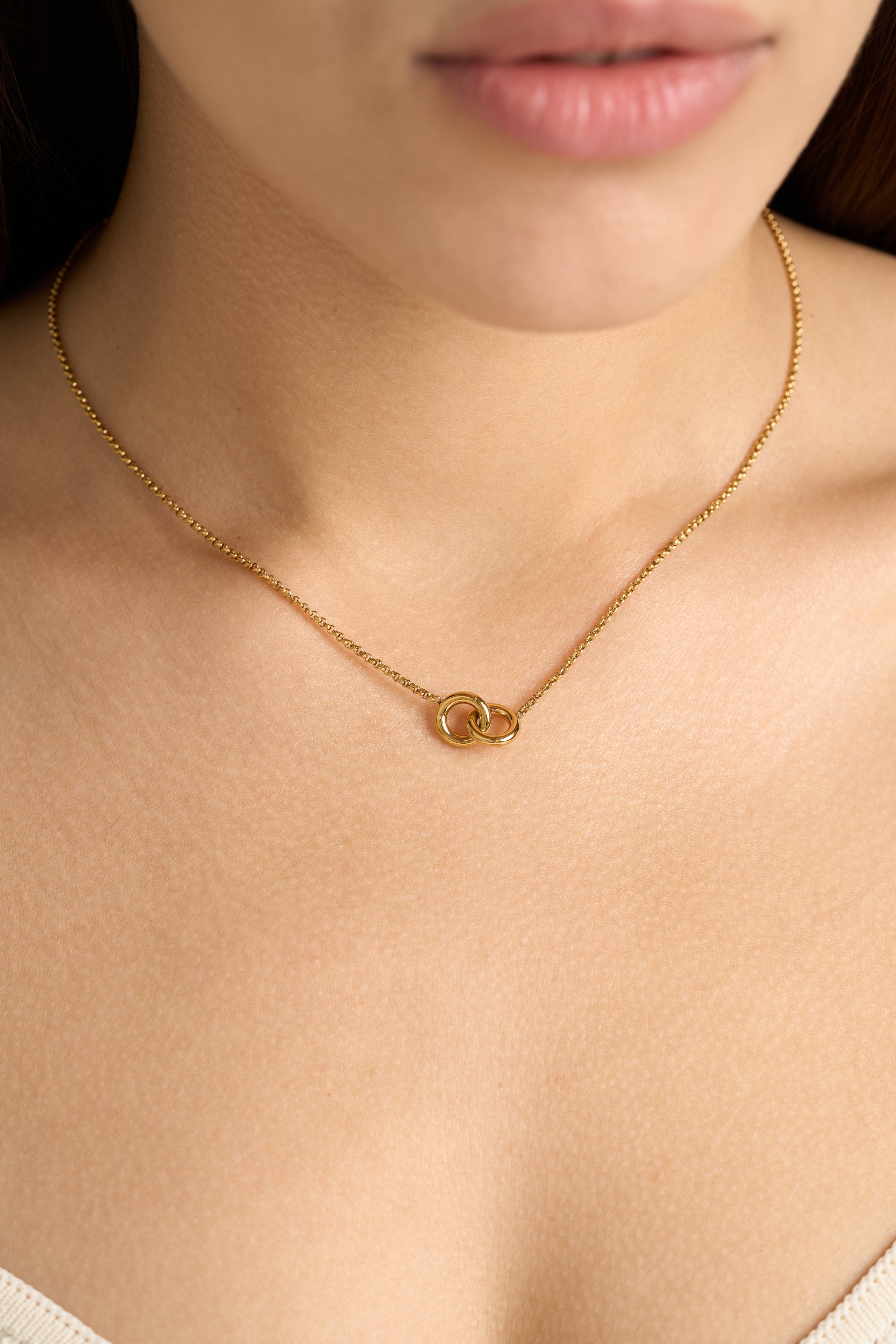Embrace the beauty of unity and eternal connection with this stunning minimalist necklace featuring two delicate interlocking circles. This elegant gold-tone pendant symbolizes love, friendship, and unbreakable bonds, making it the perfect meaningful gift or personal statement piece.