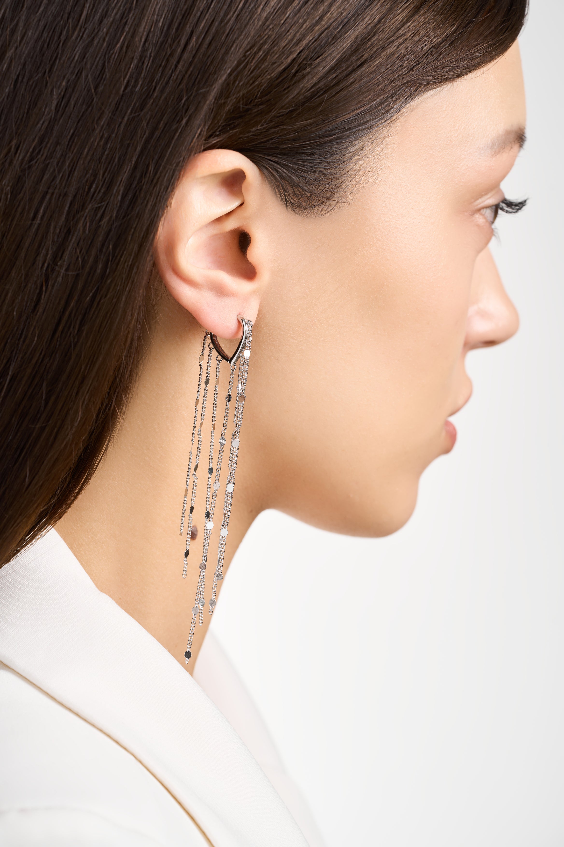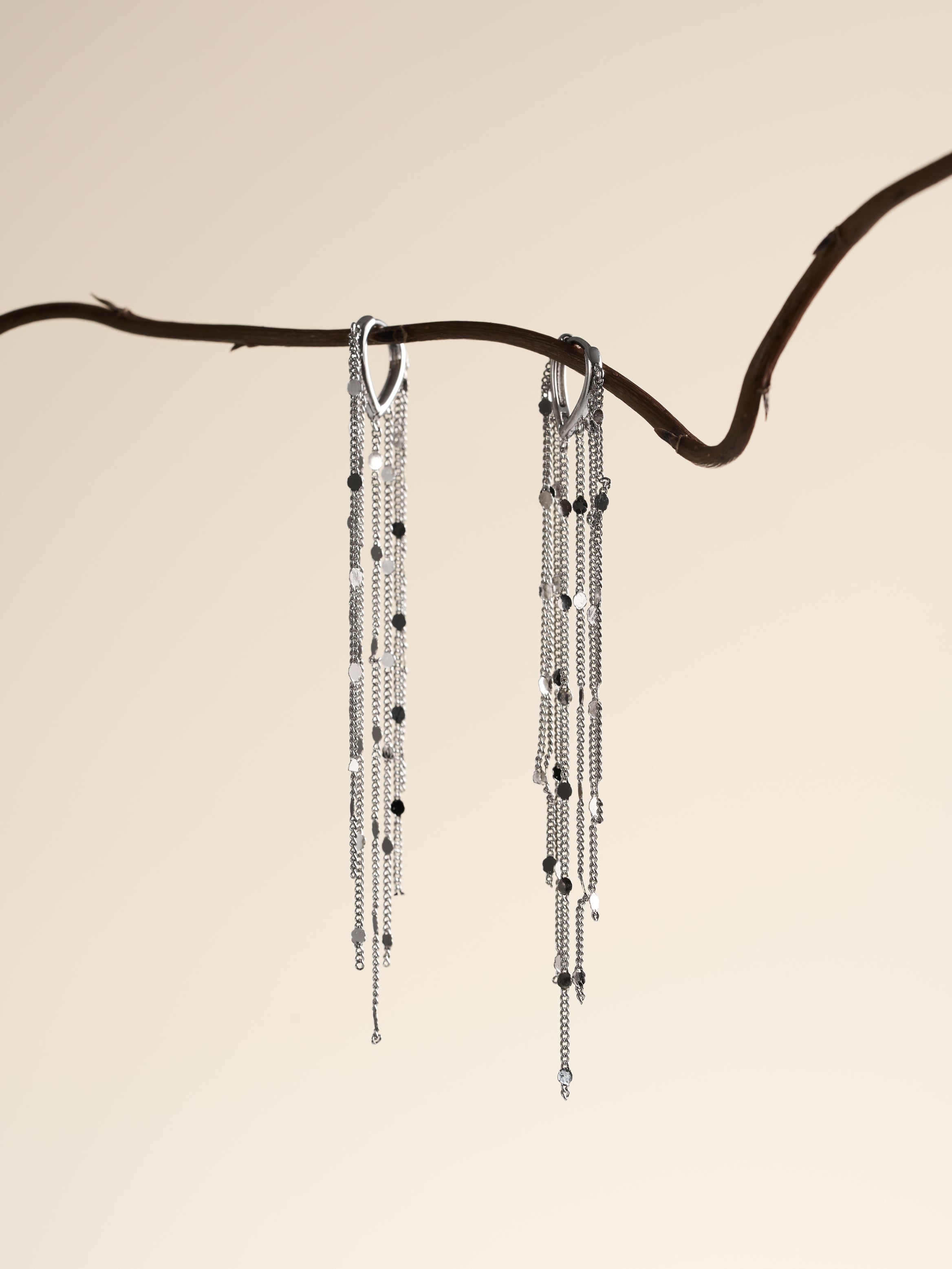 These statement earrings effortlessly elevate any look, from a simple black dress to an elegant evening gown. The movement of the delicate chains catches the light beautifully, creating an eye-catching effect that's sure to turn heads.