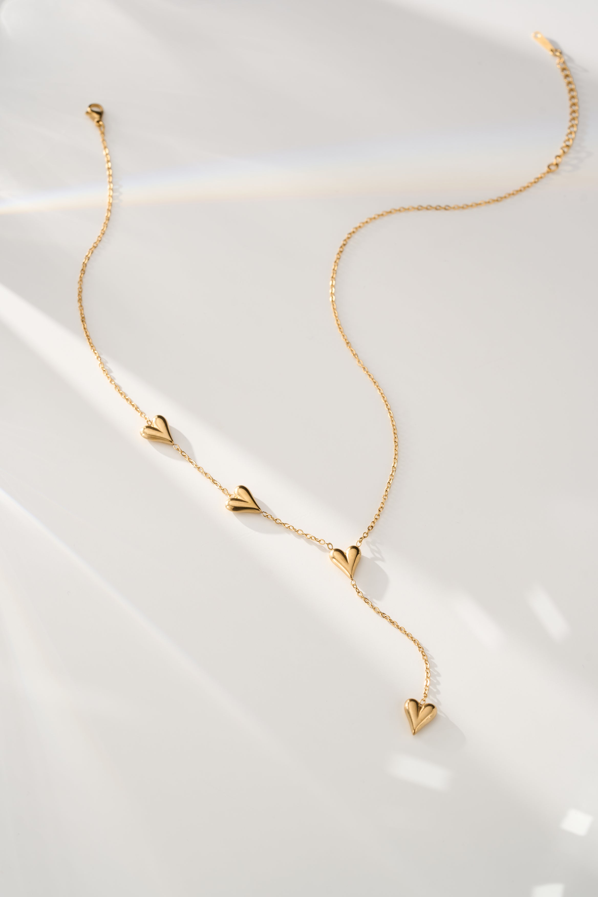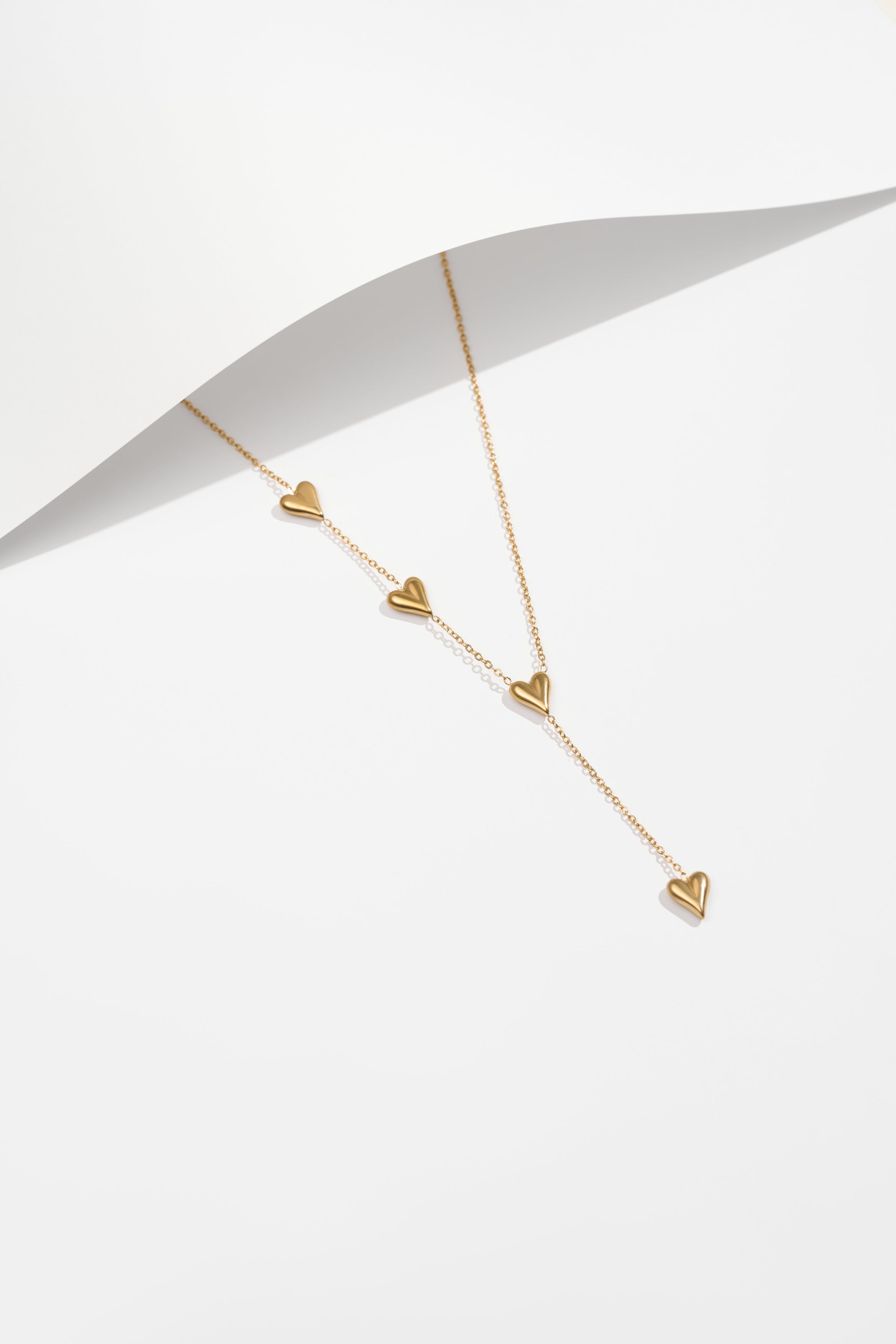 Elevate your everyday style with this delicate lariat necklace featuring dainty heart charms along a fine gold chain. The elegant Y-drop design creates a sophisticated, elongating effect that's perfect for layering or wearing solo.