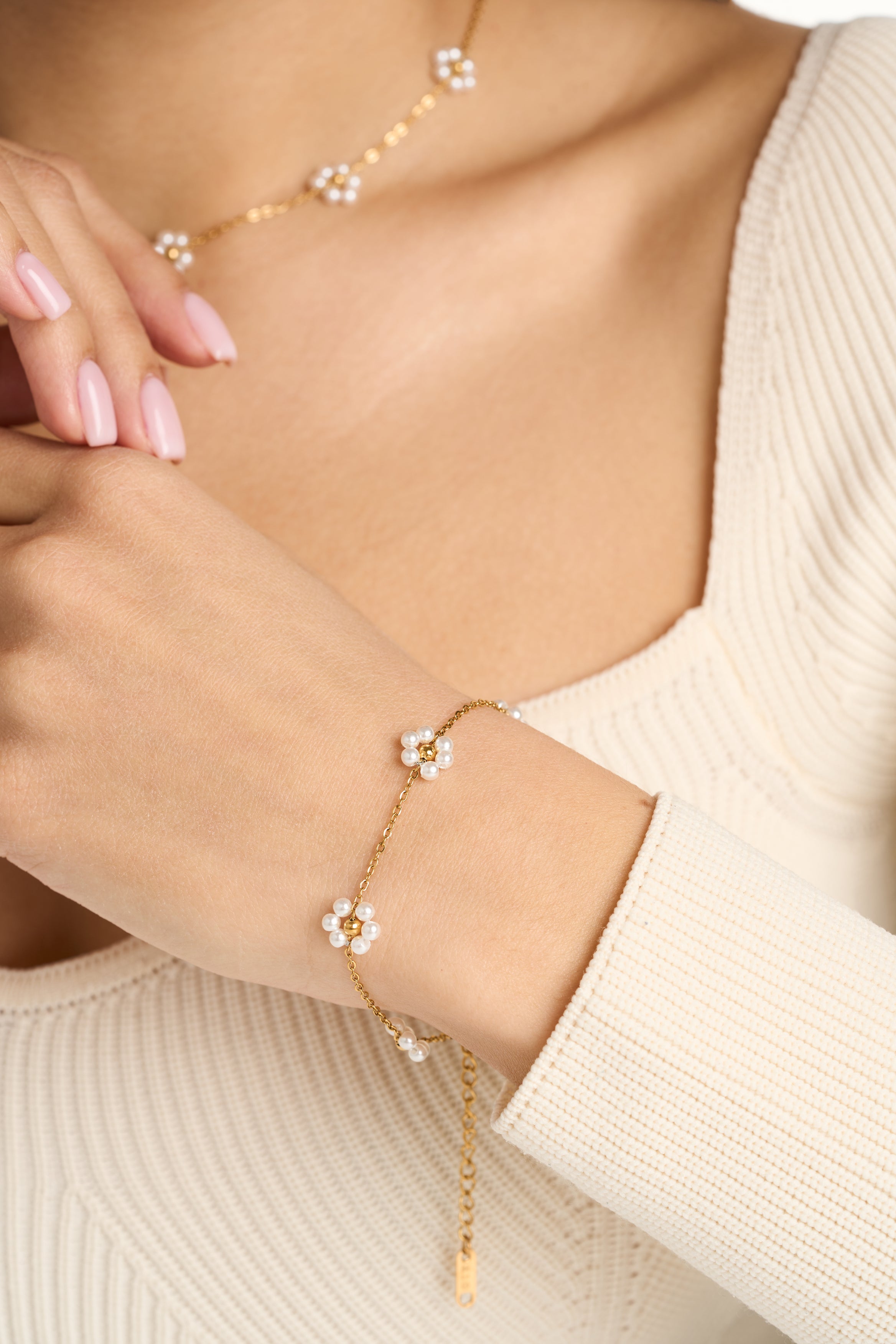 Embrace delicate beauty with our stunning Pearl Flower Bracelet featuring dainty pearl blooms along a gold-tone chain. Each tiny flower is crafted from freshwater pearls, creating a feminine and romantic look.