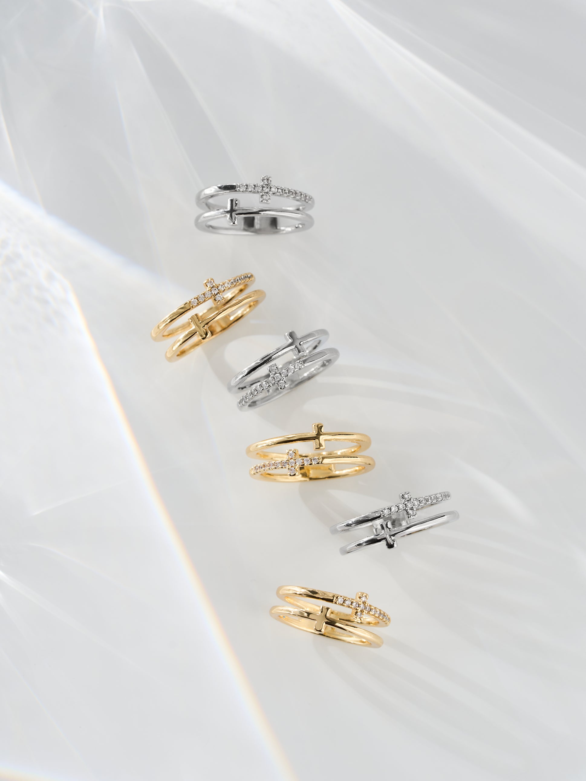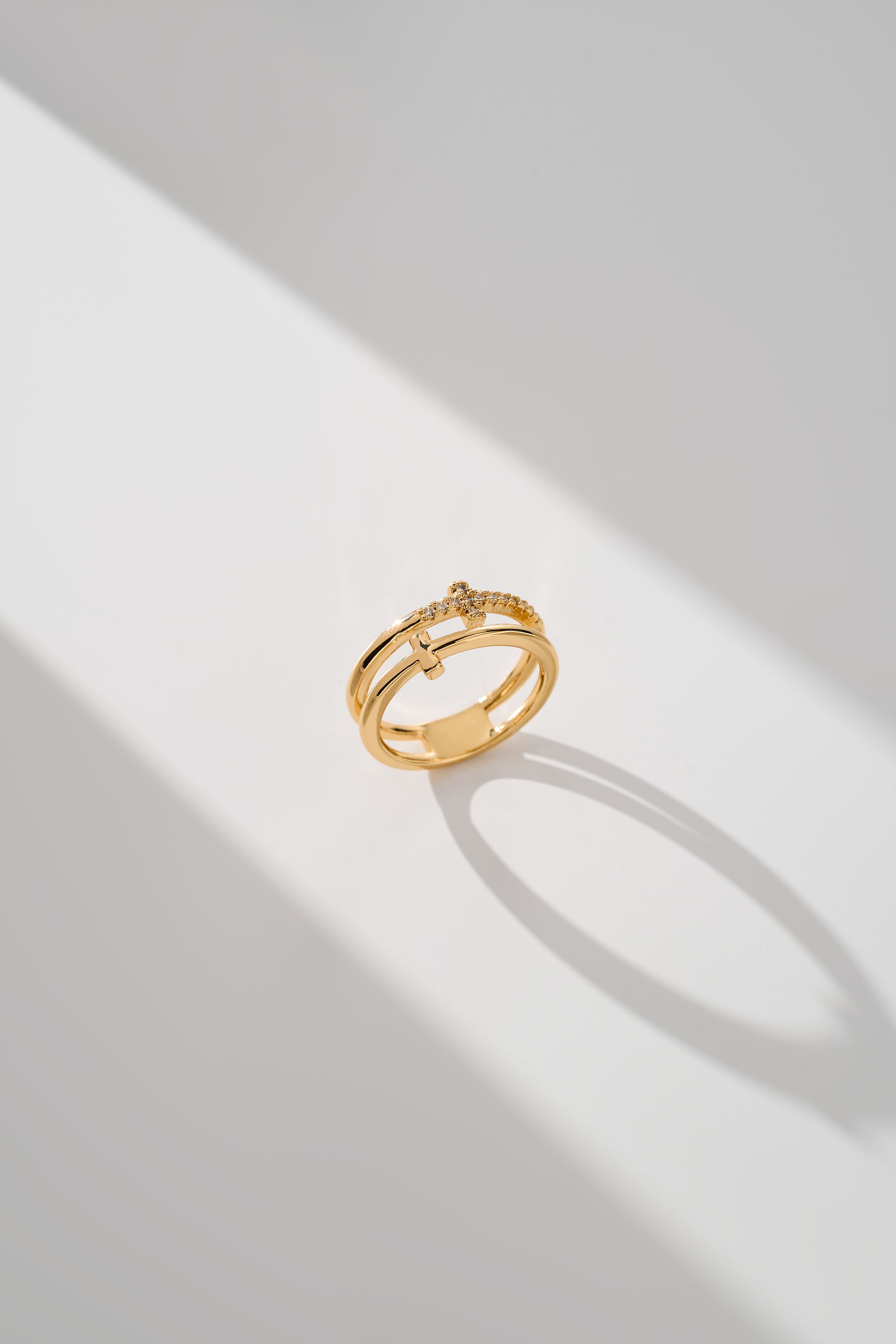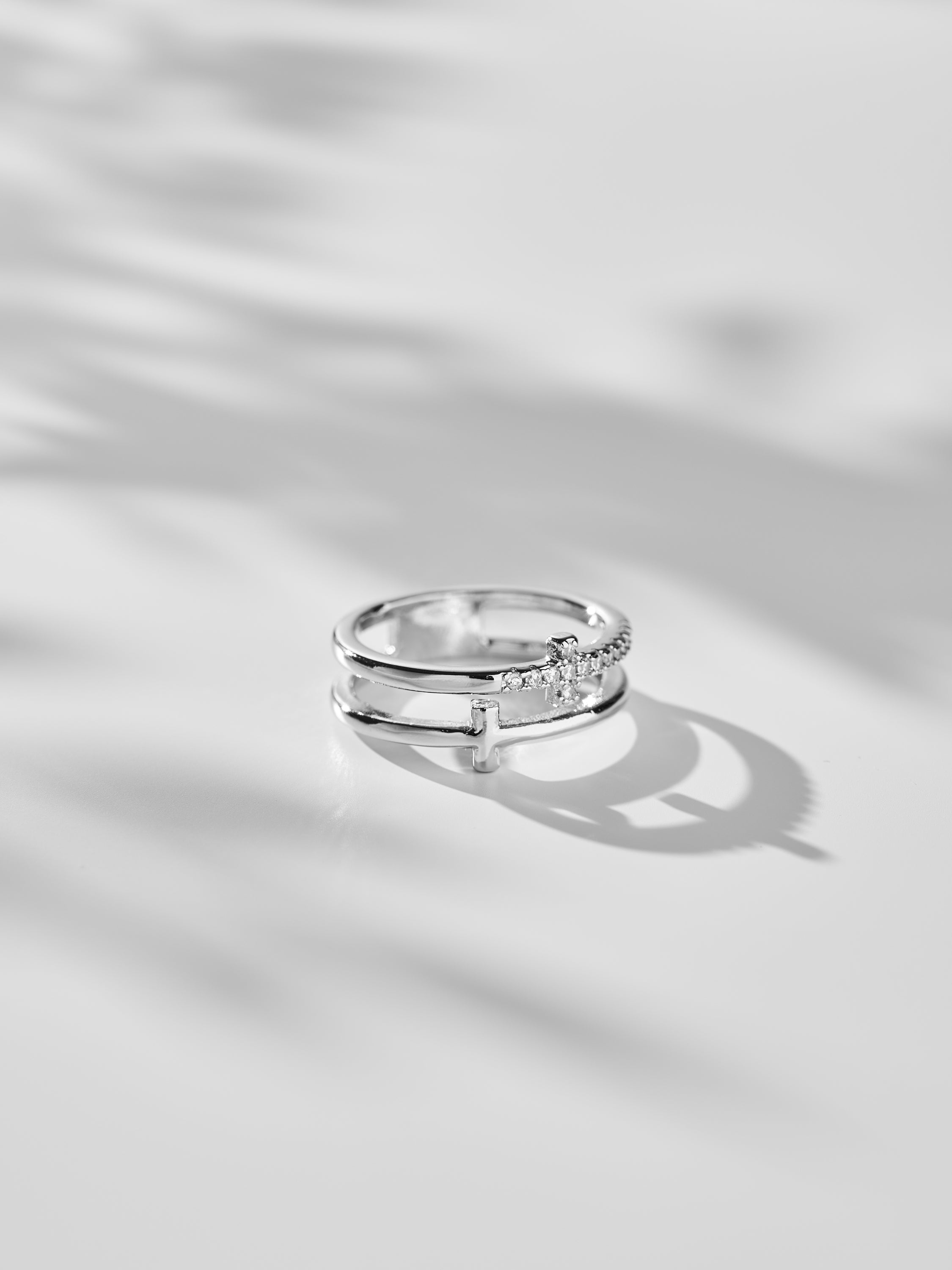 Elevate your everyday style with this stunning minimalist silver crystal ring. Featuring a sleek double-band design adorned with sparkling crystals and a delicate cross accent, this versatile piece effortlessly transitions from casual to elegant.